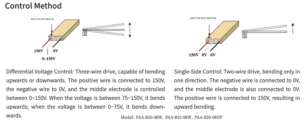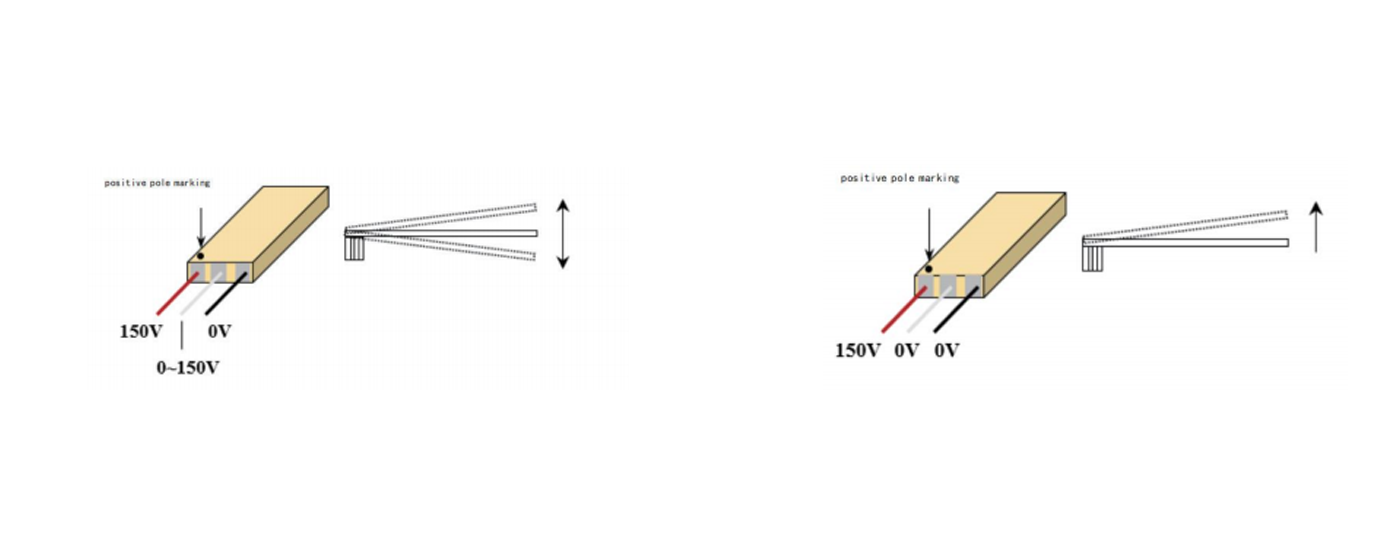 The piezoelectric bimorph is composed of piezoelectric ceramic layers and internal electrodes co-fired together, allowing independent control of the drive voltage for each ceramic layer. Standard drive voltages include 0 - 24 and 0 - 150, and they meet the requirements for low frequency, medium - frequency, and high - frequency applications.